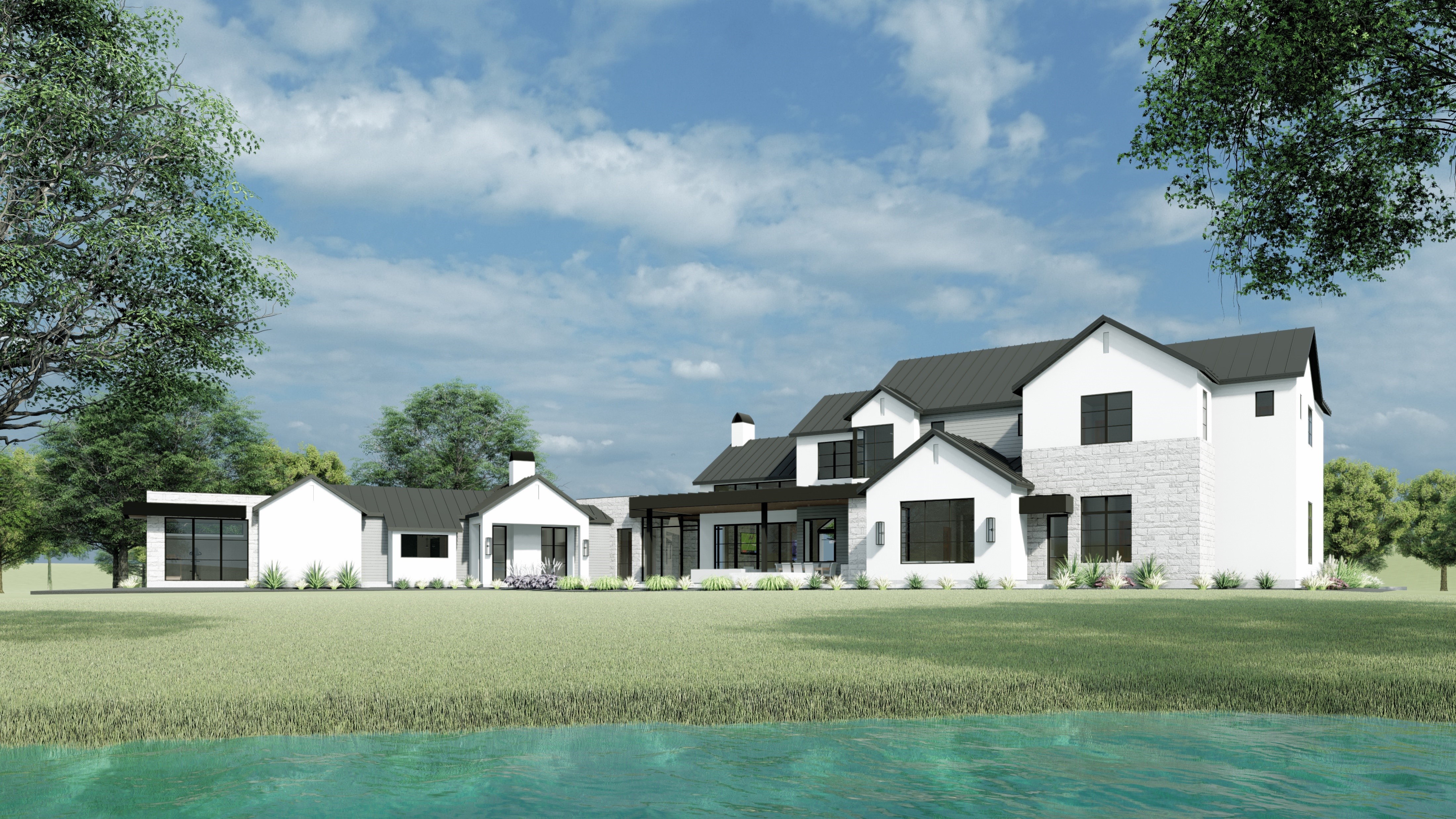 Sprawling split-level ranch style home influenced by mountain-style design with expansive views overlooking serene pond
